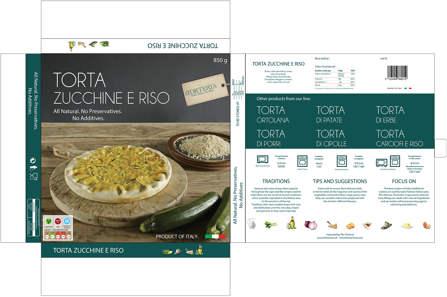 Creation of packaging for a range of traditionnal italian frozen savory pies for commercialization in the London market.